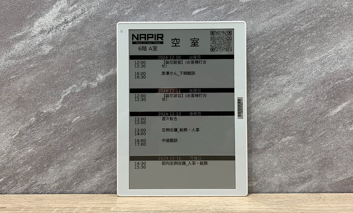 Outlookや専用の予約画面で入力された予約情報を、省電力で設置が容易なE-INKディスプレイに表示します。 このシステムにより、会議室や施設の予約状況を視覚的に確認しやすくなり、運用効率の向上が期待できます。